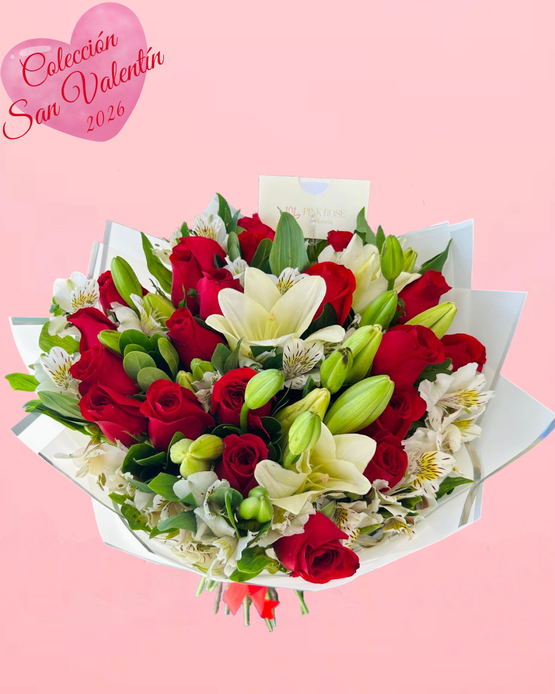 Este ramo es perfecto para sorprender este San Valentín, transmitiendo amor, admiración y elegancia en cada flor.
