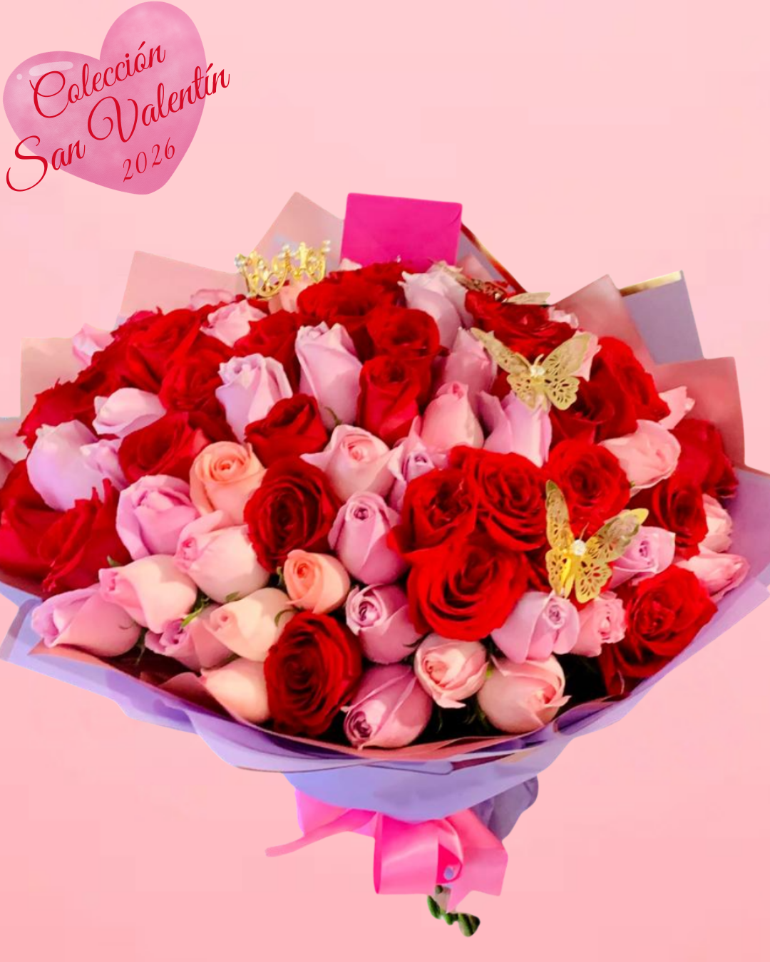 Por que muchas son las razones para demostrarle tu amor a esa persona especial, demuestraselo a través de este hermoso ramo de 100 rosas combinadas (tonos rosa claro, rojo y lila).